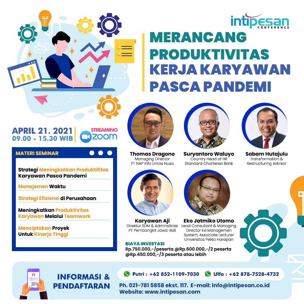 Untuk menjawab pertanyaan diatas, kami INTIPESAN Conferences ingin mengadakan seminar sehari dengan tema : MERANCANG PRODUKTIVITAS KERJA KARYAWAN PASCA PANDEMI.